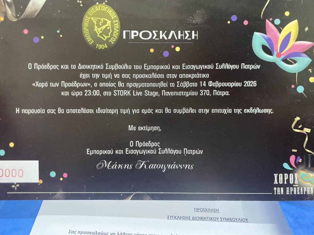 Ο Εμπορικός και Εισαγωγικός Σύλλογος Πατρών προσκαλεί τα μέλη του και το κοινό της πόλης στον καθιερωμένο αποκριάτικο «Χορό των Προέδρων», που θα πραγματοποιηθεί το Σάββατο 14 Φεβρουαρίου 2026, στις 23:00, στο STORK Live Stage (Πανεπιστημίου 370, Πάτρα).