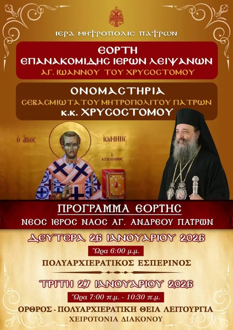 Κατά τη διάρκεια του Μεγάλου Εσπερινού, την προσεχή Δευτέρα 26 Ιανουαρίου και ώρα 18:00, στον Ιερό Ναό Αγίου Ανδρέου Πατρών, με την ευκαιρία της παραμονής της ονομαστικής εορτής του Σεβασμιωτάτου Μητροπολίτου Πατρών κ.κ. Χρυσοστόμου, θα τελεστεί μια ιδιαίτερα συγκινητική και σημαντική στιγμή για