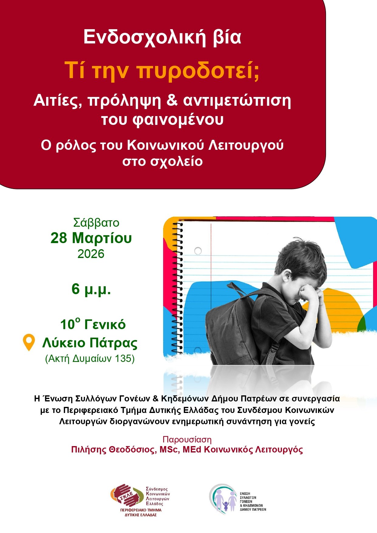 Το Περιφερειακό Τμήμα Δυτικής Ελλάδας του Σύνδεσμος Κοινωνικών Λειτουργών Ελλάδος σε συνεργασία με την Ένωση Συλλόγων Γονέων και Κηδεμόνων Δήμου Πατρέων αναλαμβάνει μια σημαντική πρωτοβουλία ενημέρωσης και ευαισθητοποίησης γύρω από το κρίσιμο ζήτημα της ενδοσχολικής βίας, διοργανώνοντας το Σάββατο 28