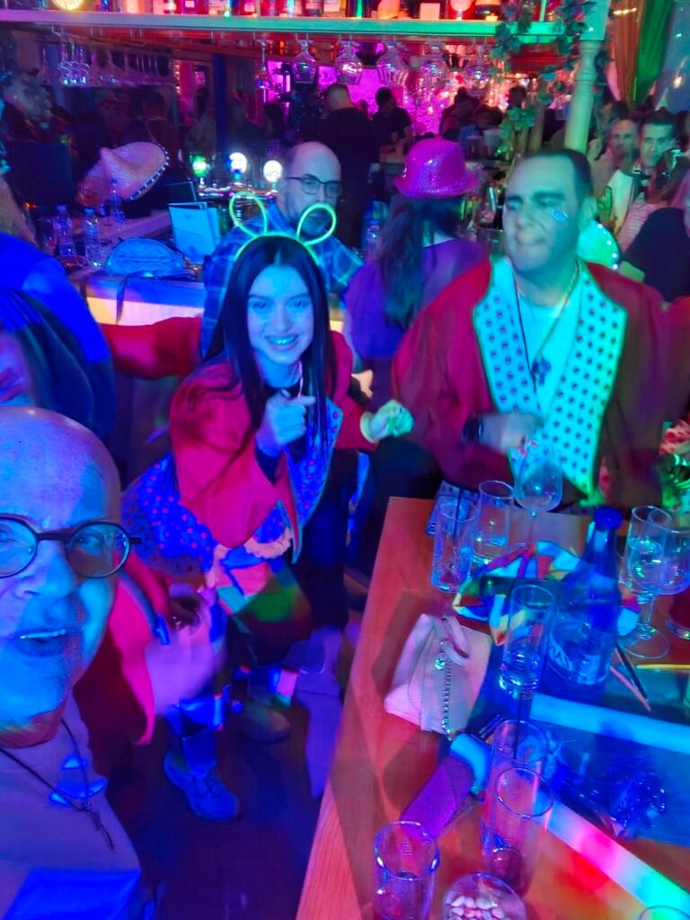 Παρέες κάθε ηλικίας, ακόμα με τις στολές τους, με σερπαντίνες στα μαλλιά και τη λάμψη της παρέλασης στα μάτια, κατέφθαναν χαμογελαστές. Αγκαλιές, φωτογραφίες, πειράγματα, χορός μέχρι τελικής πτώσεως. Το Distinto έγινε το φυσικό «μετά» της παρέλασης, το σημείο συνάντησης όσων δεν ήταν έτοιμοι να αποχαιρετήσουν τόσο γρήγορα τη μαγεία του Καρναβαλιού.